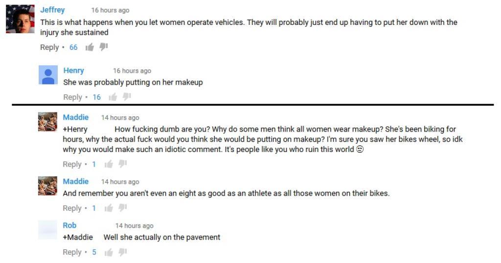 womyn in olympic race falls off her bike and eats total shit. the trolls descend on the comment section. #Olympics #triggered