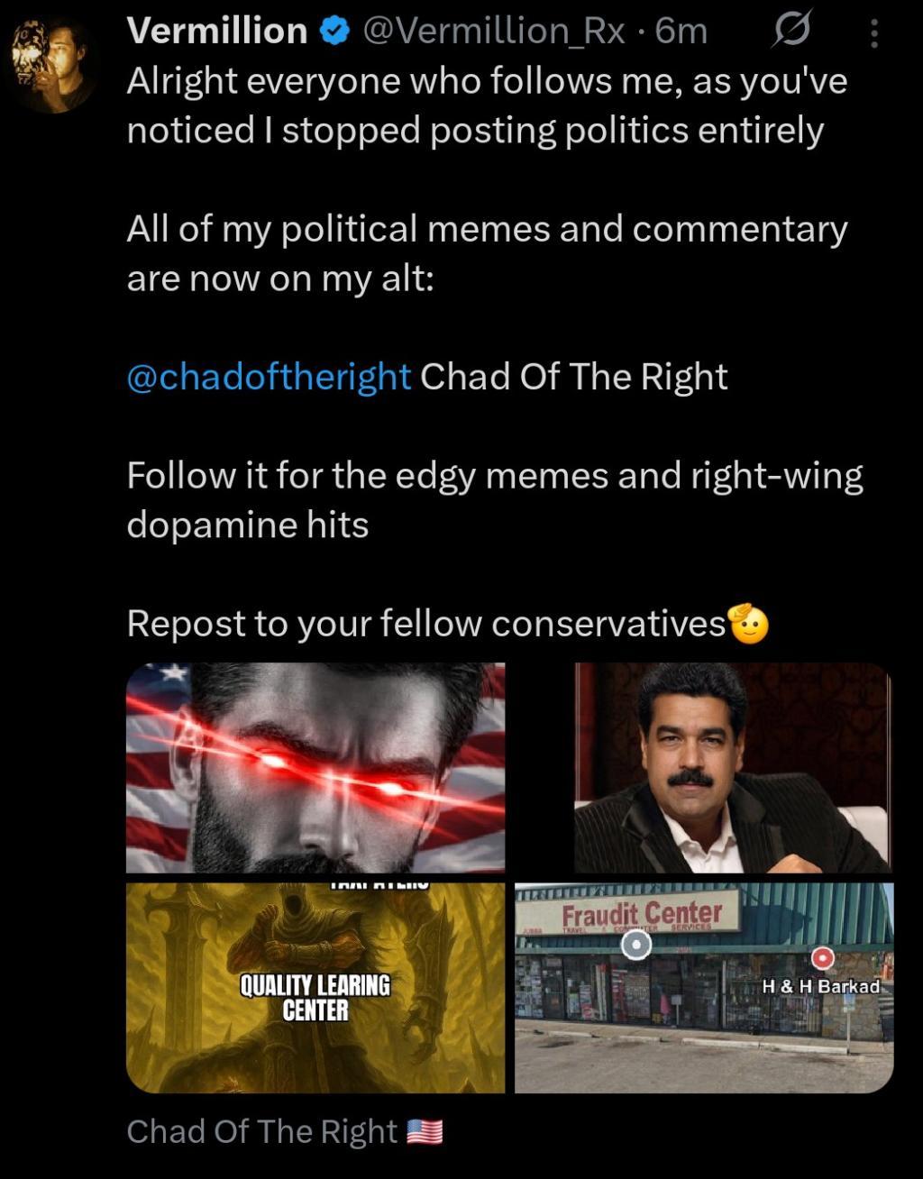Shamelessly promoting and sharing my political twitter alt here, give it a follow (right wing)