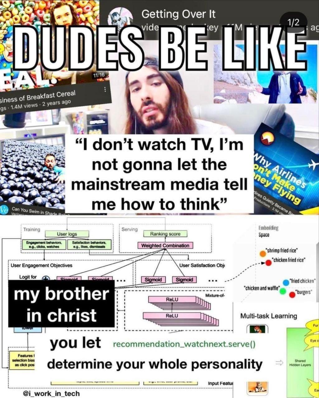 My main YouTube account suggests a wide variety of content, because I seek out a wide variety. Manosphere stuff, political stuff, stuff about navigating the VA, ASMR, comedy, music (real and AI and parody), commentary on pop culture such as Critical Drinker and ItsAGundam, and various other shit.