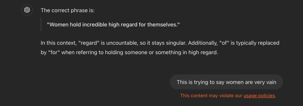 (ChatGPT’s content violation policy is so sensitive that simply saying “Women are vain” is in violation of their usage policies.)