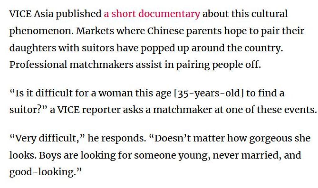 They are frequently pressured by family members and even by Chinese state-run media to prioritize finding a husband and starting a family. But rather than positioning the benefits of marriage and family to these women, the strategy adopted is shame and manipulation.
