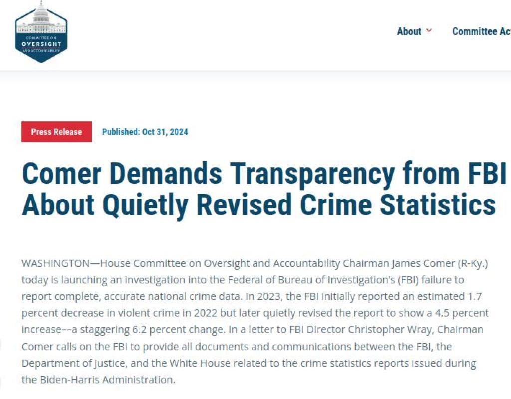 Read MoreIn 2023, the FBI released its annual Crime in the Nation report, showing an estimated 1.7 percent decrease in violent crime in 2022. The Biden-Harris Administration championed the purported decrease, but there was no decrease. The FBI failed to include in its initial count “an additional 1,699 murders, 7,780 rapes, 33,459 robberies, and 37,091 aggravated assaults,” resulting in not a decrease but an increase in violent crime of 4.5 percent in 2022. The FBI quietly revised the report to reflect this increase in violent crime but did not publicize it.