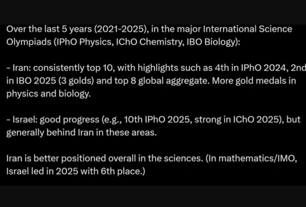 These Olympiads are individual competitions, but country rankings derive from team totals/averages. Medal cutoffs (gold/silver/bronze) are percentage-based, so absolute numbers vary by year and participation (~80–100+ countries). Both nations punch above their population weight, reflecting strong STEM education pipelines. Results can fluctuate yearly due to team preparation, host factors, or individual talent. The image’s summary is a fair, evidence-based assessment rather than exaggeration. Iran has edged out stronger overall science Olympiad positioning in physics, chemistry, and biology during this period, while Israel shone in math in 2025 and continues progressing.