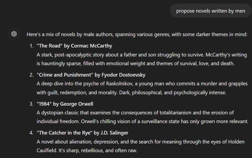 I have no idea what this user talks to GPT about that it would give him women authors when he asked for male. Hence my assumption lol bitter.